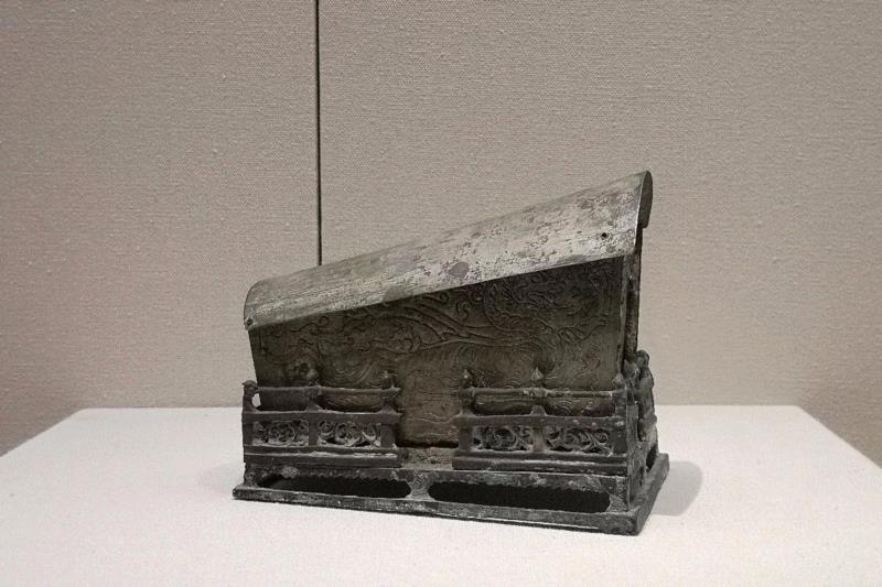玉座屏,国宝。由四块新疆和田镂雕黄玉片插接而成,高16.9厘米,宽6.5厘米。座屏两侧支架为连壁形,表面透雕加线刻的翼龙、螭虎,代表了东西方位。玉屏主体为透雕加线刻的略似半月形玉片,上片正中为西王母形象,下片正中为东王公形象。头部两侧有日月相照,左右两边各透雕跪着的羽人,周围有灵禽异兽等。这件玉座屏为供奉之物,是目前我国发现最早的也是唯一的玉座屏。”屏风至迟是在西汉时期出现,关于玉屏文献中多有记载,但出土的实物仅此一件,足见其珍贵。