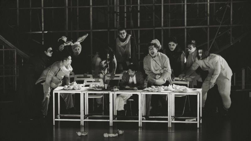 但是,这种阐释非常可能是一种过度阐释。因为毕竟,在观演的整个过程中,这一表意的逻辑链条从未真正被扭紧过。每个片段虽然各有各的精彩,但却似乎都是独立的。整出戏的基本结构是模糊的。有趣的是,从已经发表的剧评看,几乎没有人能够清晰地描述其基本结构。这一方面自然因为我们缺乏影像材料和文本,仅凭记忆无法还原整体;但另一方面,也正说明了其结构本身的杂乱状态。一些关键的场次是可以被清晰地辨认的,比如“诗人大蜘蛛”“革命者宣教”“两兄弟分老婆”“王利发独白”等,一些明显的过场处理也较为清晰,比如骷髅影像、rap、作家的独白等。