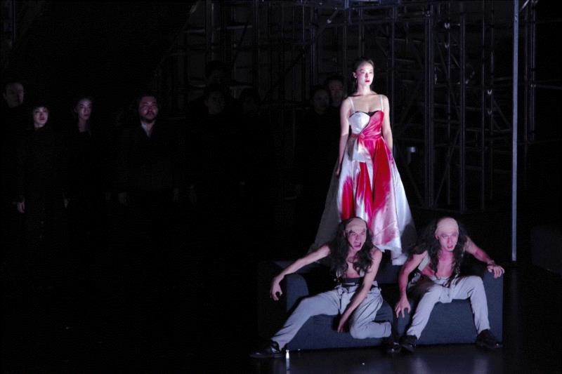 在老舍小说中,“她”一方面被“我”所这么纯情地爱着,另一方面则被其他的男人们侮辱与损害着。孟京辉则将这其他的男人们,内化为“我”的一部分。因为“她”的厄运,怎么可以与“我”无关呢,就好像杀死苔丝特蒙娜的必须是奥赛罗,怎么可以是伊阿古呢?更进一步看,即使将“我”分裂成两个分身,互相争辩与对抗,这两个分身,依然是男性的两个分身。在这过程中,女性实际上从头到尾都是失语的。因此在这段戏的结尾,孟京辉让这个女性终于获得了开口的机会。她的台词是这样的: