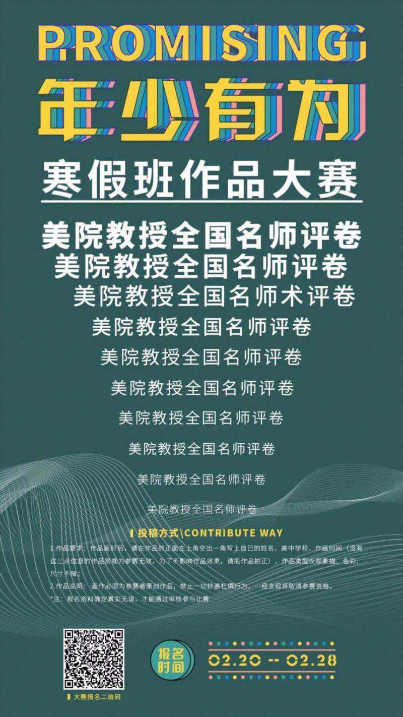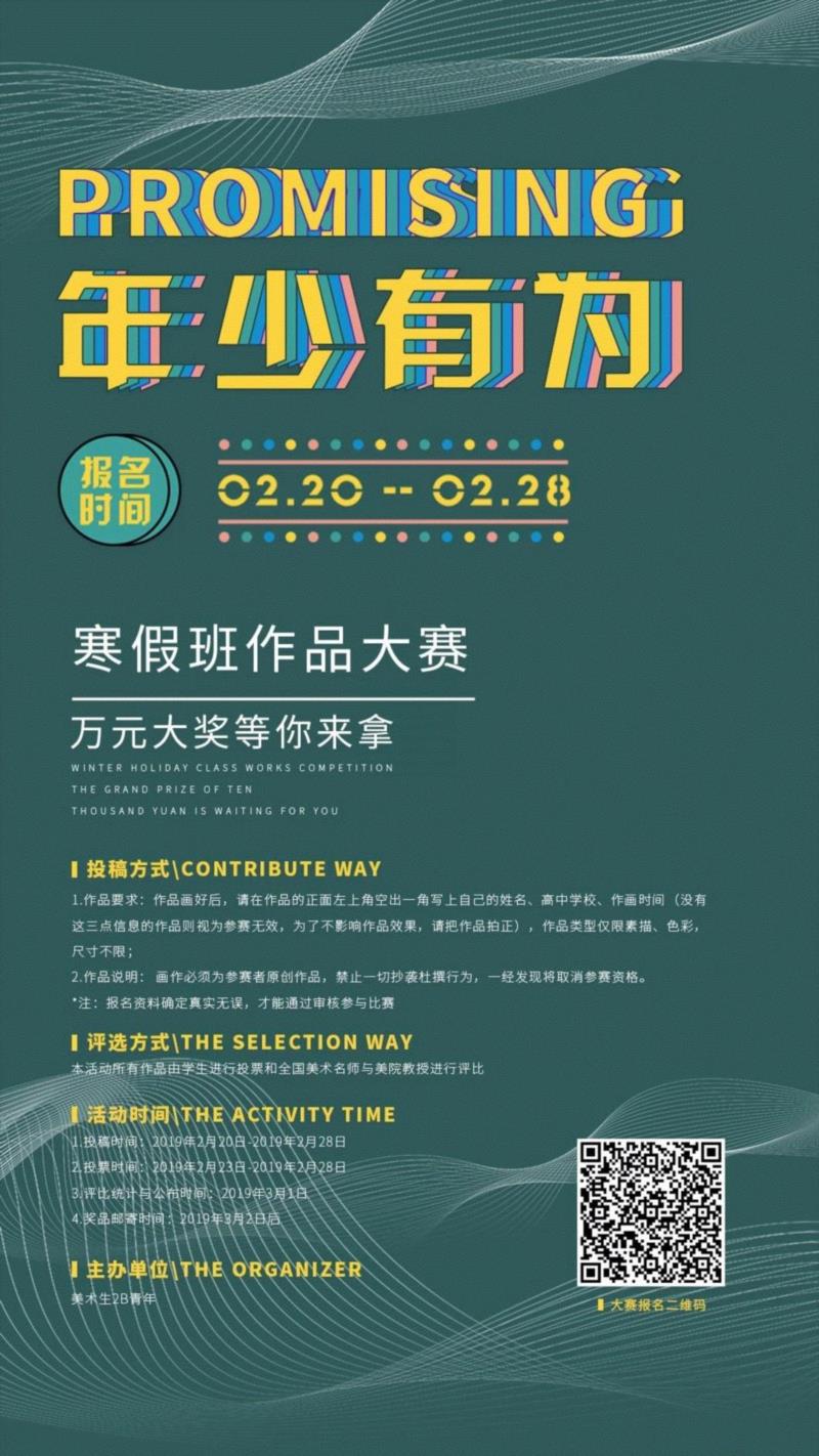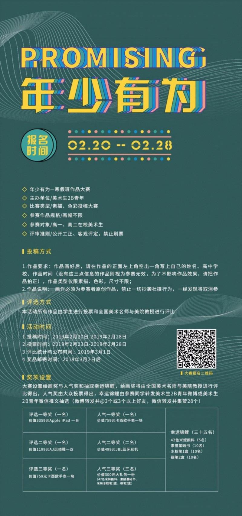 各位同学们,为促进大家的学习热情,培养大家的艺术兴趣,美术生2b青年正式推出《年少有为——寒假班作品大赛》,为大家提供一个展示自己的舞台,为同学们提供一个提前接触美院老师的机会,当然更有精美礼品等你来拿!