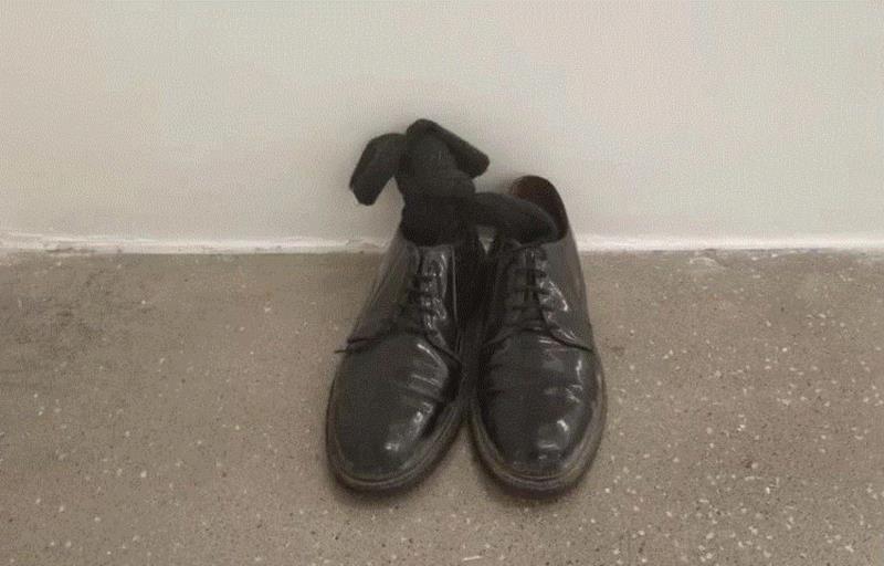 埃利斯最大程度上发挥了材料的象征性来传达这种断裂。鞋在他作品中多次出现,这个自梵高以来就与劳动挂钩的视觉符号,也作为大地的阳具,曾在08年的影像《遇河之前莫过桥》中被改制成了举过孩童头顶的小帆船,沉浮于虚无的浪尖,隔海相望的人桥则暗示了最深刻的疏离与漂泊。这两件作品在因果链上构成埃利斯“乡愁-鞋”之寓言的两极:前者是进步对“存在”的褫夺,由羊毛袜拧成的孤独之环中,主体已不知何去何从,词的冲突在“僭主-赎罪祭品”式的对立之间转化(羊毛这一元素在普遍的神话里寓意着赎罪与献祭),剩下的只有一个功能性的空壳;后者则暗示了一种分离的危险——河是恒常的存在,桥才真正面临着漂泊的命运。