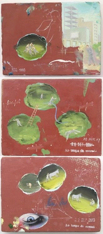 断裂也体现于戏剧意义上的间离(Verfremdung)和陌生化:通过在重大转折处制造停顿,比如《排演》系列;或者安排一种处于边界线两侧的状态,如割裂的绘画(《剪切》)、两只鞋、桥、绳索/棍棒两端人物的对峙(《睡眠时间》)以及其它以To beor Not to be为导向的作品(《Do/Undo》、《Real/Unreal》),这些要素在《睡眠时间》(Le Temps duSommeil)中达到饱和:所谓Le Temps duSommeil实则是作为行动的反面——停滞(sommeil)乃至阶段性反射/沉思(Le temps de la réflexion)而存在,埃利斯精妙地将“梦”这种在希腊人那里普遍存在的神谕功能嫁接入他的寓言,红色基底和叙事图景形成一种窥探的视域,若干个镂空的洞和拼贴的眼睛发挥着灵媒的作用,相对于画中遭受分离之痛的、格式化的人物而言,观众无疑是置身于超验时间流中的观审者,站在神谕的一侧并完成了对行动的历史性省思。以上陌生化和徘徊不定的结构都旨在引起对行动的价值重估,同时引出一组关于行为的对立,即内在的欲望和功能性的理智。在亚里士多德那里,由理性构成的判断-抉择环节总结出实践方式是否能达到目标,“抉择的总原则是..策划——通过怎样的方式去达到最终的目标”[6]。但事实上,意愿与判断并无法保证主体介入决定的中心——行为,当主体由某个抉择靠近命运,完成使命却意味着做出悖逆使命的事,其闭环的人生经过了断裂并跌向非历史的时间。在希腊人的行为观念中,“个体和群体对未来的掌控具有极大的局限性”,而实践投入的规划越少,越忽视目标…行动就越接近完美,完美的行为“就是消除主体及其行为之间的一切距离,让他们在一个纯现在的时间点上彻底重合。”[7]在巴塔耶看来,从计划与理性出发投身行动是对生命与存在的延迟:“进步…混淆了生命与计划,一旦计划被认为是严肃存在,生命只是一种合法的幼稚状态。”[8]其与埃利斯对行动的反思相契合:吞噬主体的实践即是充满人工机巧的重复。