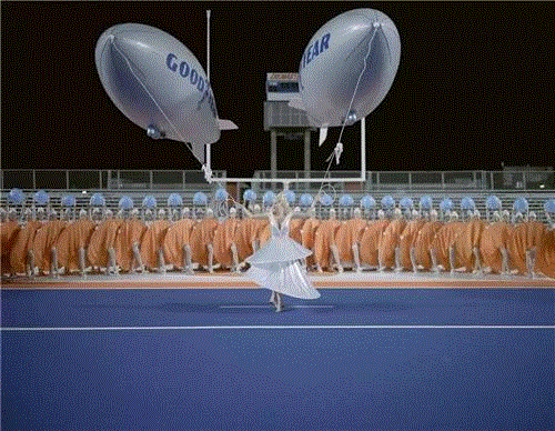 《悬丝1》是一部在覆盖着蓝色草皮的球场上呈现的音乐剧。两个古德伊尔软式飞船(Goodyear Blimps)像飞艇一样漂浮在舞台上,通过电视直播体育赛事。每个舱室内部都摆放着一张铺着白色桌布的桌子,由一个抽象的雕塑所装饰。唯一的声音是柔软的环境音乐,暗示着发动机的声音。在球场上的太空中,一群空姐和艳舞女郎正完成复杂的舞蹈和动作。