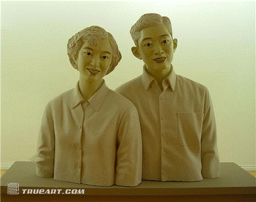 这些令人难忘的人物雕塑竖立在一起,面带微笑,盯着观众,努力展现自己最好的一面。他们不仅着装一致,而且都涂成了白色,就像一群被用视觉手段转化成过去褪色记忆的鬼魅。只有妍音的母亲在私密时刻(一人独处或与父亲在一起)的作品中身上涂了一些颜色,有的在夹克上、头发上,有的则在嘴唇上、眼镜上等。我想,这是因为她是主角,是唯一一位向雕塑家袒露内心的人。回到那些二维画作,我们可以看到,黑白老照片变成了以灰色调或深棕色色调为主的油画。她这样处理的目的是突出这些照片的历史价值。绘画技巧简明,但也可以称为现实主义手法。