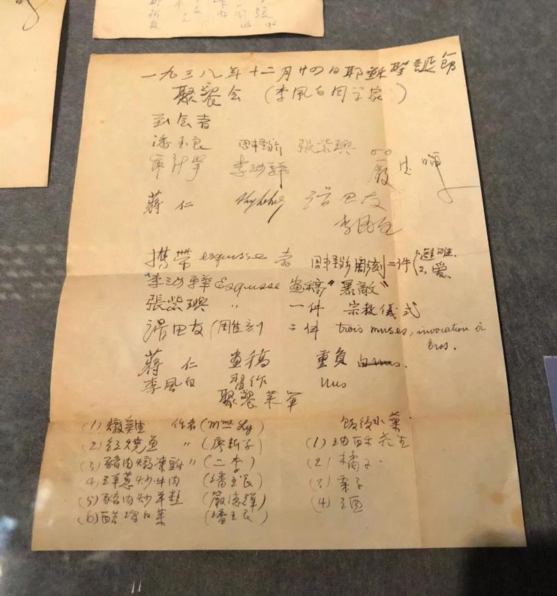 展柜中,一张发黄的纸上签满了艺术家的名字,这是当年中国留法艺术学会的成员们在李风白(留学于巴黎美术学院)家中举办圣诞聚餐时的邀请函,红烧鱼、洋葱炒牛肉、醋溜白菜等拿手菜赫然在列,充满着浓浓的情谊。