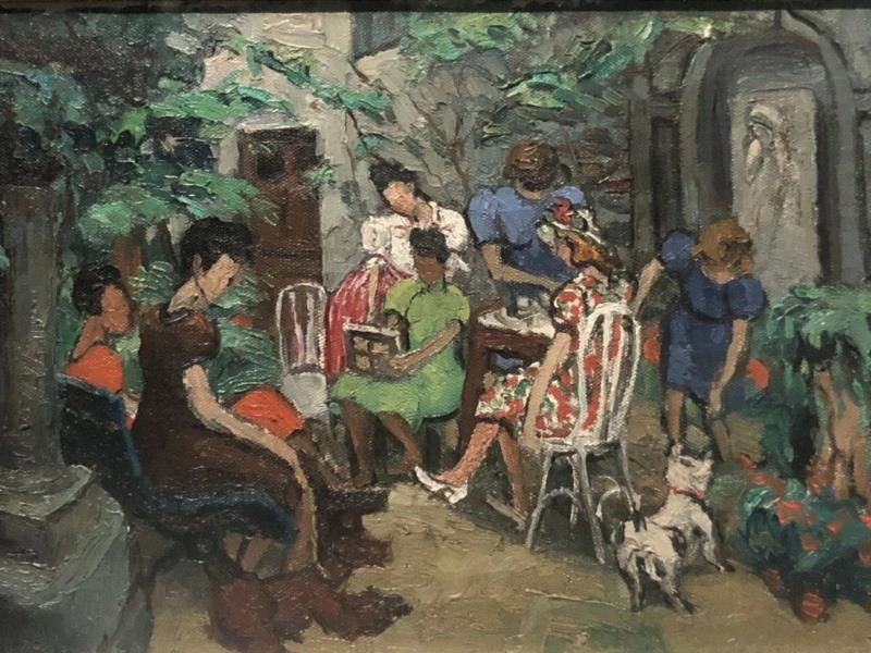 她这样的创作方式,有助于我们理解潘玉良创作中对不同个体的细节处理以及对画面整体构图的把握。这七位女性聚于私人花园,潘玉良坐在正中审视着画稿,其他六位友人则在一旁讨论她的创作,人物的错落排布,光影的协调柔和,皆反映出潘玉良等人在接受西方绘画训练后,对透视、明暗关系的熟练处理。