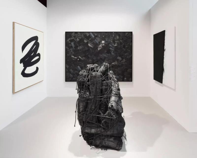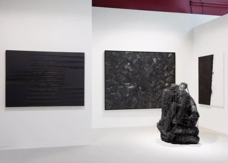 贝浩登2019巴塞尔艺术展展位现场. 从左至右:皮埃尔·苏拉奇、李英培. ??Pierre Soulages / ADAGP, Paris & SACK, Seoul 2019. 图片提供:艺术家与贝浩登