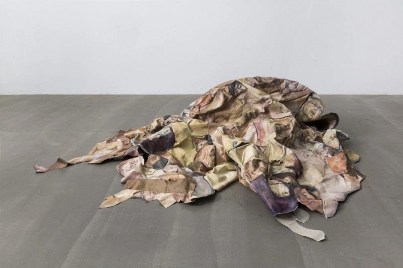 In Contemporary Painting I (2018, oil on canvas (a lot of oil paintings collected from other people are spliced and stiched after cutting), 195 x 160 cm, frame: 150 x 130 cm), Hu takes the abandoned canvases of his artist friends and students and sews them together. On first acquaintance, the wall-mounted work, which employs a traditional canvas stretcher, seems to play on similar notions of “Expanded Painting”, as practiced by artists such as Angela de la Cruz, resulting in an abstract wall-mounted relief. As we keep looking though, the details of the crime emerge: Prometheus as cannibal. In Flesh Color (2018, oil on canvas (a lot of oil paintings collected from other people are spliced and stiched after cutting), dimensions variable) a sheet of portraits lies in a crumpled heap on the floor, faces gazing out at strange angles, their bodies intertwined and tangled.
