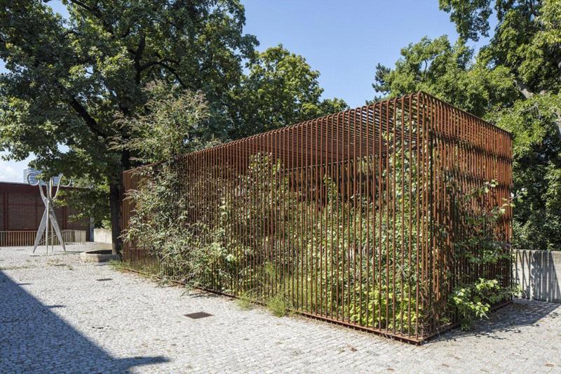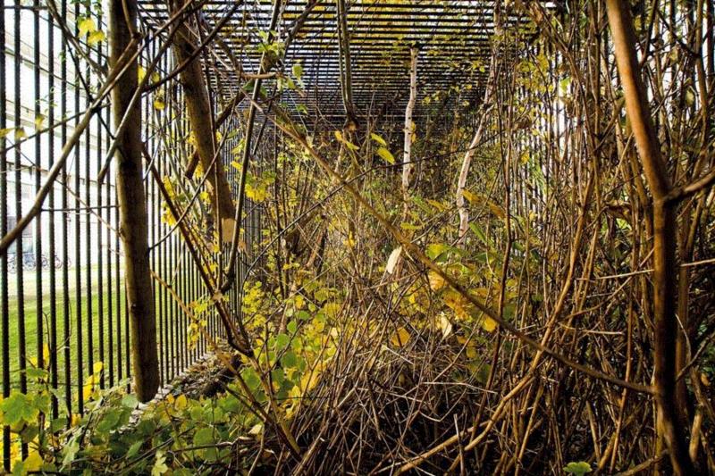 1998年,温伯格在因斯布鲁克大学(Universityof Innsbruck)新建的社会科学中心门前,为“杂草(ruderals)”(野生植物,或在荒地和垃圾堆上生长的“杂草”)建造了一个37米长的围栏,取名为“花园”(Garden)——一件充满诗意的现场/田野作品。在这个间隔紧密的由钢筋制成的笼子里,人类被拒绝进入。因斯布鲁克大学前院的混凝土路面裂开,取而代之的是一层薄薄的泥土,其深度由下面的地下停车场决定。这个被艺术家称为“城市空间中的空隙”7 的这块飞地,随后被废弃,它就留给了风、鸟类和已经存在于地球上的种子来“重新造林”8,与“文明的浪费”相结合,作为时间的综合组成部分累积起来。9