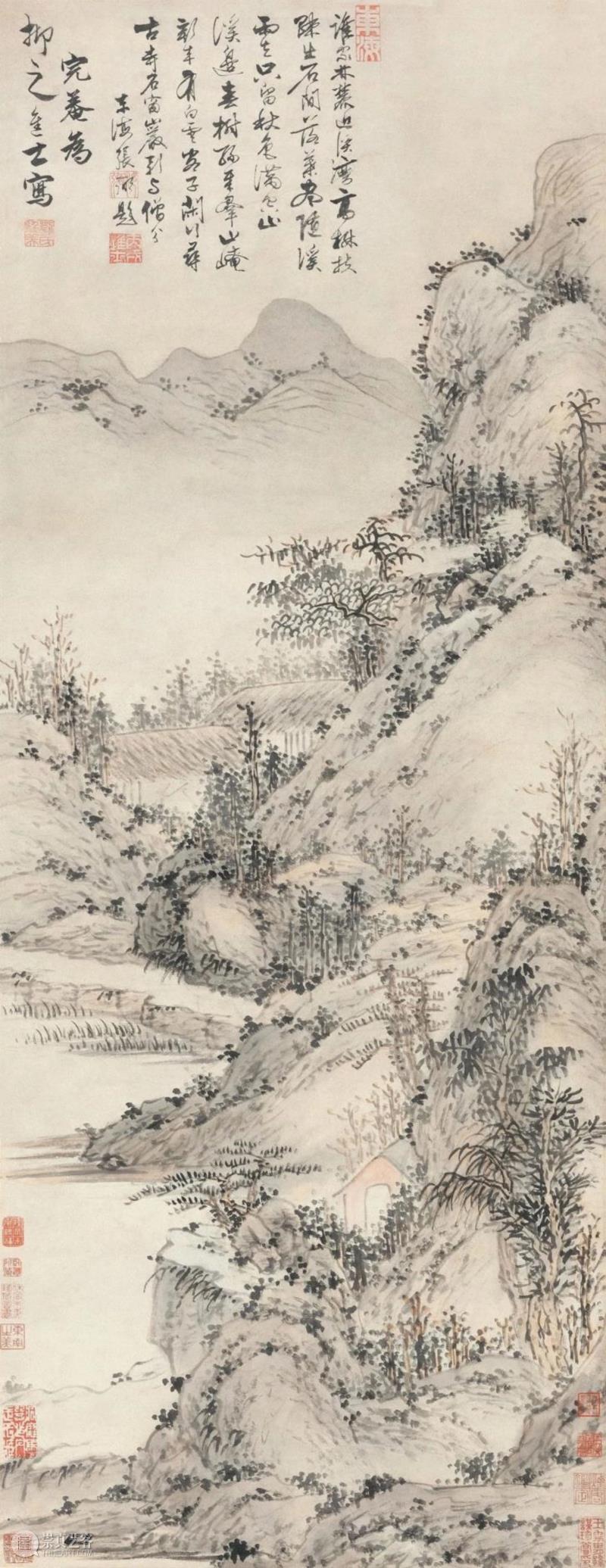 此件刘珏为“抑之”作《山水轴》,纸本设色,纵118厘米,横45厘米,该轴经同时代书法名家张弼(1425-1487)题诗,王时敏(1592-1680)、朱之赤(17世纪)、秦敏树(1828-1915)、陆心源(1838-1894)陆树声(1882-1933)父子、永安沈氏家族(清末)、张群(1889-1990)等诸多名噪一时的鉴藏家鉴藏,著录始见於陆心源编纂的《穰梨馆过眼录》卷十三,而后见裴景福纂《壮陶阁书画录》卷八。该画是完庵为明代书画家马愈所作。马愈,字抑之,号华髮仙人、马清痴等,嘉定(今属上海市)人。著名院体画家马轼之子,明英宗天顺八年(1464)中甲申科进士,官至刑部主事。能诗,善书,工山水,登逸品。台北故宫博物院藏有其传世书法作品《暑气帖》,著有《马氏日抄》。此轴虽未署年款,但根据完庵落款“为抑之进士写”,张弼题跋钤印“丙戌进士”,马愈是天顺八年(1464)进士,张弼是(1466)进士,由此可推,此作的创作时间是1466年(时年完庵56岁)之后,是其辞官归隐的晚年之作。