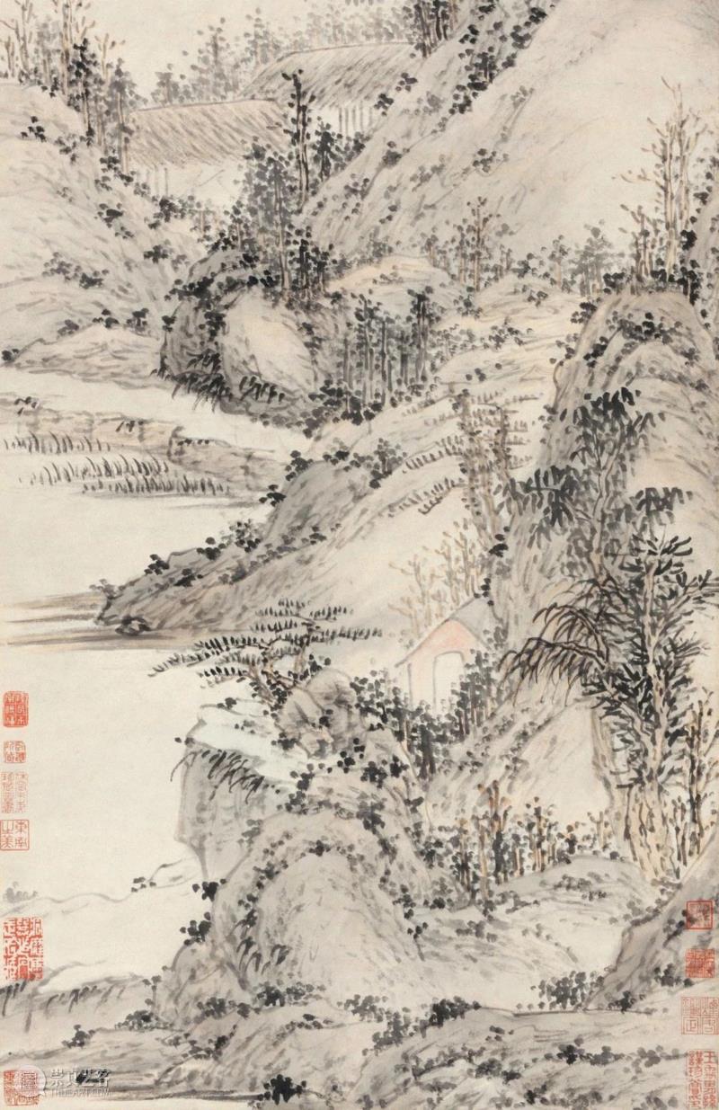 此外还应提及的是,此画最早入藏於明末清初王时敏(1592-1680)之手,王时敏出身世宦之家,祖父王锡爵为明朝万曆年间内阁首辅,家本富於收藏,其中很大一部分藏品是从董其昌处直接购得,“得之京师者十之四,得之董文敏者十之六。”例如黄公望的《陡壑密林图轴》、《良常山馆图轴》、《仿董源夏山图卷》等皆曾经王时敏珍藏,之后该画入藏於清初鉴藏家朱之赤(17世纪)之手,朱之赤,字守吾,号卧庵,别署烟云逸叟,安徽休宁人,迁居江苏吴县。入清后,为南京朝天宫道士。学问渊博,喜收藏书画,并精於鉴别。书画收藏名重一时,收藏精品如董其昌纸本《仿倪云林山水》、沈周《松溪小坐》、马愈《暑气帖》、文徵明尺牍等等,今多已入各博物馆。之后由道光、咸丰间吴门画家秦敏树鉴赏。秦敏树,字散之,又字稚枚,别号林屋山人等,苏州洞庭西山秦家堡人。能诗,工山水,曾入湘军幕府。又“以簿尉任浙,曾任天目山巡检”。同时经陆心源、陆树声父子鉴赏,并著录於陆氏《穰梨馆过眼录》,再后入“永安沈氏”家族收藏,永安沈氏,是清末福建永安沈氏望族,收藏书画甚富,目力甚佳,今故宫博物院、上海博物馆所藏古代名迹,常见钤有“永安沈氏藏书画印”。此画到了民国期间,由国民党元老领张群鉴藏。张群字岳军,四川省华阳县(今属天府新区)人,早年就读保定陆军速成学堂,1908年赴日本,就读振武学堂,与蒋介石为同学,其后曾参与辛亥革命、二次革命、护法运动等。1927年起先后任国民政府兵工署长,上海市长,湖北省主席,国民政府外交部长(1935-1937),之后历任国民党中央政治会议秘书长,行政院副院长(1938-1939),四川省政府主席等职。1947年4月到1948年5月任行政院长,后任重庆绥靖公署主任,西南军政长官,行政院政务委员。