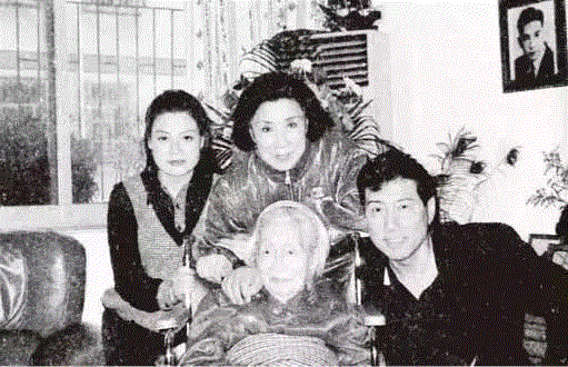 前排右起:儿子张道宇、王玉龄母亲罗老夫人、王玉龄。右上角挂着的,是张灵甫的照片。