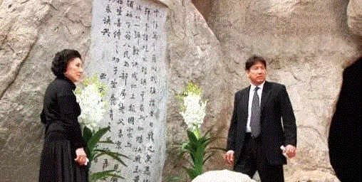 2007年10月,王玉龄和儿子张道宇,在74师指挥部旧址外张灵甫将军遗书题刻前敬献鲜花