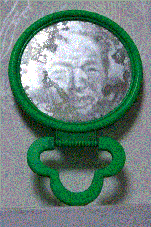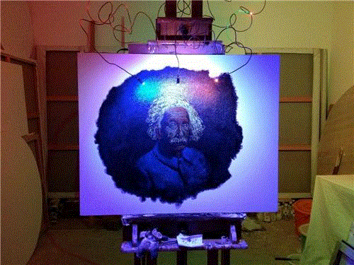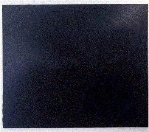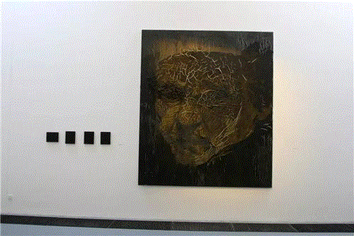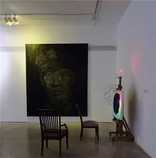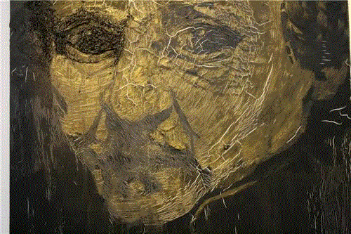 在他的黑色系列的那些作品中我们会感受到另外的不同,他的黑色画面的作品,譬如伦勃朗的那组作品,都是在灯光下作业的,他尝试着用颜料表面的油质反光来成像。在这组作品中我们能够体验到打开灯光与不打开灯光时截然不同的外在视触觉与内在心理触觉的复杂变化。在不打开灯光的情况下,我们正面面对画面时,图像呈现出残缺的状况,这种残像只有0.5的维度,而打开灯光的时候则是3维立体的完整效果,不过这个效果只能在左右30°的夹角范围内才能够看到,超出这个范围则没有了。而随着这个视角的继续加大之后我们会发现图像重新变得残缺不全,在左右两边的成像度都只有0.5维。在观赏这组作品之后,我们的内心仍然会合成一个心里的视觉形象,这个形象也不是完全3维的,我们也应该将它确定为2个维度。