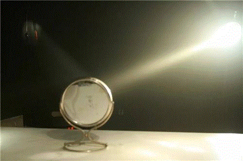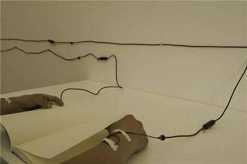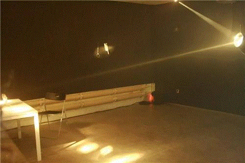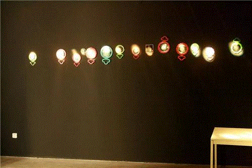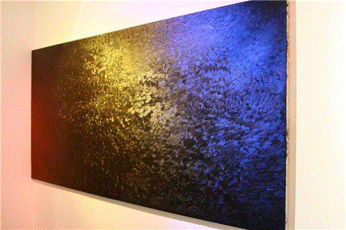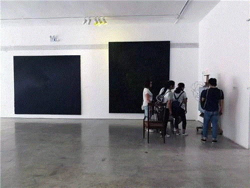 这组黑色的作品给我们一种潜入心灵的神秘的东西,当灯光亮起来的时候,我们看到很明确的图像,但是我们感受不到这个图像的真实性,它是一种假象。而灯光熄灭的时候,那种残缺的画面又折磨我们的视觉,我们总是想移动视线,想从某个角度找到那个被隐藏起来的东西。可是那个被隐藏起来的究竟是什么呢?在这组作品中灯光成为绘画的一个合理的组成部分。