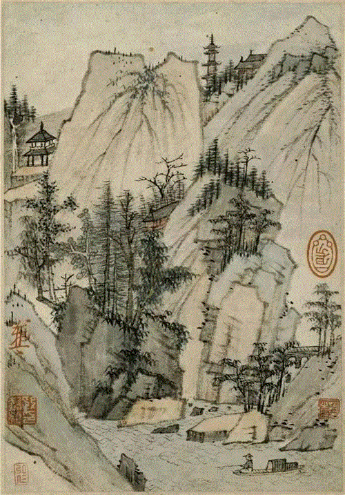 这套册页属于弘仁流传作品中的极精品,又包含他稀有的使用色彩的画作,比如第三开。相对其他开而言作者描绘了一个更显复杂的山景,但作者对山石的分割布局极有章法,座座石崖均有向右倾斜之势,从左下角开始以S形曲线重叠而上,直达右端最高点。山石轮廓以干笔淡墨写出,并整体施以润泽而透明的蓝色与赭石,色彩的浓淡显出远近层次。山中建筑几处明亮的朱红色运用与蓝色调形成对比,使画面更添神采。