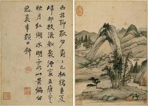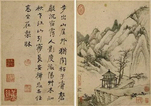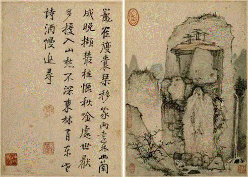 据册页第九开对页的文字可知,这套册页是画给莲茹居士的,他嘱托弘仁画十开并在对页加上书法。于是弘仁选择了十首明代画家沈周的诗。但我们现在只能看到九开有对应的书法了。17th-Century Chinese Paintings from the Tsao Family Collection书中提到这些诗的原标题都可以在沈周的《石田先生集》中找到。