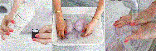 先倒一瓶盖的细致衣物洗衣精到冷水里,切记真丝物品一定要用冷水清洗