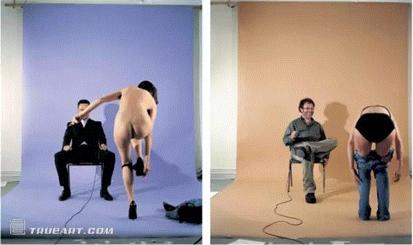受赫尔穆特?纽顿(Helmut Newton)那张著名的《与妻子和模特一起的自拍像》(Self-portrait With Wifeand Models)启发,贾米玛?史塔莉(Jemima Stehli)的很多作品以女性的视角探讨对于性及性别的窥视欲(scopophilia)。而在《脱掉》(Strip)系列中,这个探讨添加了新的维度——她找来包括评论人,艺术商,策展人等在内的男性艺术从业者,让他们面对相机坐下,而自己则背对相机面对这些男性开始脱去衣服,快门控制器握在男性的手中,何时按下快门由他们决定。艺术行业乃至普遍性的性别和权力的问题成为这组作品另一个层面的思考。