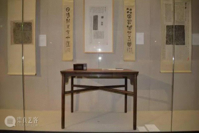 清代宋牧仲紫檀大画案,牙板上刻有光绪末年清宗室溥侗的题识,文云:“昔张叔未有项墨林棐几,周公瑕紫檀坐具,制铭赋诗契其上,备载《清仪阁集》中。此画案得之商丘宋氏,盖西陂旧物也。曩哲留遗,精雅完好,与墨林棐几,公瑕坐具,并堪珍重……”。此段题识中提到的项墨林棐几,所幸历经劫乱,仍留人间,为本次“金石齐寿——金石家书画铭刻特展”中重器。