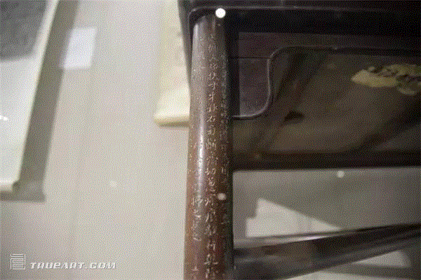 正因为劫后馀存,因此张廷济对能收藏此件项氏棐几更觉幸甚庆甚,故其继而感歎到“何木之寿,岿然灵光,定有神物,呵禁不祥”。又自撰了此篇128字长铭,更请其族兄张燕昌书写并锲刻于腿足之上。铭文最后十六字揭示了撰文与锲刻者,即“爰铭其足,廷济者张,书以付契,其兄燕昌”。