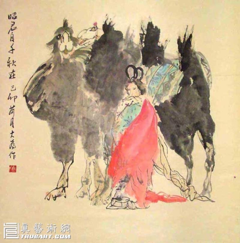 一般说来,刘大为的古代题材的历史画,与他的现代和当代题材的历史画有所区别:通常他的古代人物造型比较自由随意,笔墨恣肆,色彩瑰丽,艺术风格既有史诗般的恢宏气势,又有牧歌式的浪漫情调,特别是那些伴随着古装人物频繁出现的马和骆驼形象,更接近他的风俗画作品。