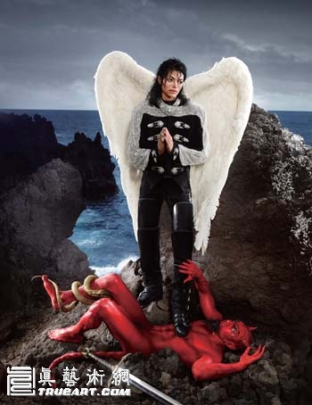 a:是的。我把他塑造成大天使的形象,因为我总是觉得杰克逊象征着纯洁与无瑕。我花了很长时间调出杰克逊1990年左右的模样。我认为它是一张照片,但不是肖像。在某种程度上,它重新定义了什么才是照片。我们花了很多时间用在修改细节上,当然,没人怀疑那不是迈克尔·杰克逊,但是他本人又从来没有真正拍过这样一张照片。所以这是一个很奇怪的概念。在某种程度上,这种方式像绘画。