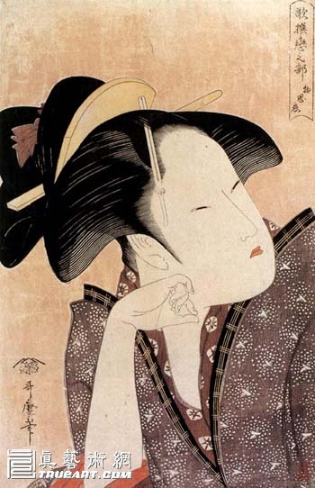 18世纪末期是浮世绘版画史上的黄金时代,原稿画师大显身手,雕印师们精工细作,套色精美的浮世绘版画风靡江户地区乃至全日本。喜多川歌麿(生年不详—1806)堪称大器晚成且后来居上,将美人画推向空前绝后的顶峰。