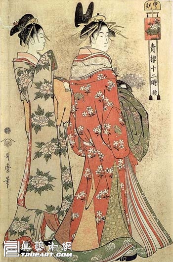 《青楼十二时》系列是喜多川歌麿表现吉原游女生活细节的代表作。在当时的江户,没有严格的时间概念,按照习俗,一个“时刻”即两小时。全系列共12幅,随时间推移选择了游女生活有代表性的内容。通过特定的服装样式及其纹饰表现特定的人物,体现出喜多川歌麿对吉原风俗的了如指掌以及对游女生活的细致观察。