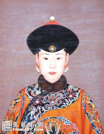 细观此幅油画仕女肖像,画中的青年女子仪态端庄,头戴貂毛冠,身着黄底绣团龙袍服,佩戴着晶莹硕大的珍珠装饰,衣着装束尽显其高贵的满清后宫妃嫔身份。由于画上无任何身份明示和画家署名,人们只能通过存世的其他清宫后妃画像来做出判断。