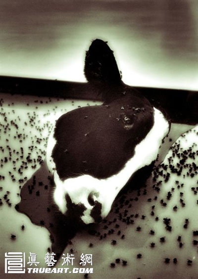 《一千年》(a thousand year),1991年damien在作品里还频繁地使用日常素材,这可以在作品《对逃亡的后天无能》(the acquired inability to escape)里看出来。一个人造环境里,光滑的具有设计感的现代玻璃窗认真地提醒我们这是一个玻璃缸,或者动物圈养场。艺术家所展示的是,尽管在对逃避现实进行彻底尝试,但试图想要摆脱这种白领阶层的存在圈套是不可能的。典型的办公风格元素作为人类出席过的痕迹,同样也发人深省。