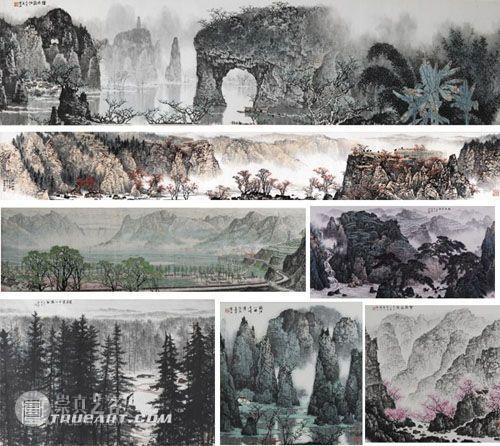 他对自然的敬畏,对艺术的虔诚,探索不怠的创新精神,让他放不下桂林山水,也割舍不去牵魂系情的漓江,上世纪七十代年至新世纪,他前后十三次赴桂林,踏遍漓江,再师造化,再悟漓江神韵和妙境,再赋诗意。在生活中,他的笔墨诗意不断深化,他的桂林山水精品大作不断问世。1972年以来的几十年间,他应邀为中南海、人民大会堂、全国政协、中联部、外交部、钓鱼台国宾馆、北京饭店、北京火车站等国家机关及地方政府和企事业单位创作丈二巨幅山水作品百余幅。其中巨幅山水《千峰竞秀》《云壑松声》《千峰竞秀 万树争荣》《云海松涛》《古赛春晖》等都是他杰出的代表作品,在社会上具有很大的影响。