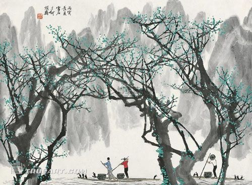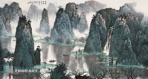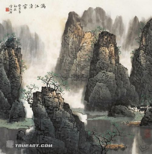 白雪石先生所做的漓江山水无论是经典的巨制,还是精美的盈尺小品,都有一股清秀明快,淡雅润泽,飘逸灵透,清新亮丽之气,他的笔法古朴、稳健,或点染、或皴泼,气聚神凝,笔随心动,技艺法度自然天成,成为唯真唯美“白家山水”笔墨样式和语言的典范。