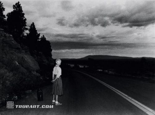 这一系列因其简洁而值得称道,尤其是画面的灯光。“在室内拍,我只会用一盏落地灯或一个旋扭灯泡,那种便宜的铝座灯泡。”而室外则可能更简单,纯靠机缘巧合。著名的“短篇广告”(hitchhiker,无题,1979)中,舍曼顶着蒂比•海德莉(Tippi Hedren)般的金灰色头发,穿着棉布格子裙,站在一条公路的转弯口,背景是沉甸甸的西部天空,一只无所畏惧的小型滚轮行李箱站在她旁边。这张照片由舍曼的父亲拍摄于当时家庭公路旅行经过亚利桑那州的黄昏。她收拾了自己的行头(其中许多都是从纽约市郊的折扣城淘来的),一路上换着装扮,但唯一不换的是那个崭新的长焦镜头。当她发现一个有潜力的场景,就让车停下,穿上一套行头,摆好姿势,朝着爸爸挥舞手臂,喊道:“好了,就现在!”这些一次快门成像的系列短剧从其随机发生的时间与地点看来称不上“照片”。但是这种创作媒介的整个历史当然业已从偶然中产出为那些相框中的舞台设计;当时、1970年代,纽约艺术界正风起云涌——沃霍自然首当其冲——那不过是装腔作势的耍赖。《无题影片静帧》(Untitled Film Stills)的首次展出是在市中心的一个艺术家空间(Artists Space),舍曼是空间的时任前台招待。她接受了《艺术新闻》(ARTnews)杂志的专访,来访人的名字她永远也不会忘记——(任谁都不会忘记)——Valentin Tatransky——自那之后,她新作不断。
