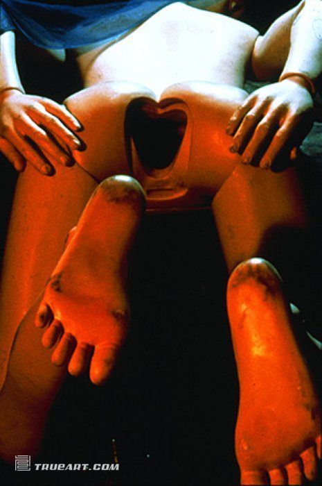 “那是我的一场小暴动,”她像个小丘比特一样天真烂漫地说出这句话。但我也没必要和辛迪跳探戈舞。这场暴动的来源很有可能是Andres Serrano的作品“撒尿的基督”(Piss Christ)对道貌岸然的国会之谴责,还有罗伯特•马普斯若普(Robert Mapplethorpe)的同性恋照片,当然也少不了杰夫•昆斯(Jeff Koons)以他三级片明星妻子为模特——“蹇得很”——舍曼如是说,并用“性图片”(Sex Pictures,1992)系列给予回应,这个系列可一点也不蹇,而是凶猛好斗的。在这绝无仅有的系列中,她把自己挪除了,而是采用医学解剖般精确的塑料模特来摆出野蛮色情的荒谬姿势:它们都是那么无以言表的精巧。她将模特身上的某些原配部位拔除,只留下敞开的孔窍;在一个被卸下的汽车后备箱背面铺一块绸缎毯,一男一女两个模特躺在上面,周围其他几个模特的不同部位被扭转开,只把头部与男女主角的头部靠在一起,画面中从后备箱的一头露出那枚阴茎,另一头露出草木繁茂、塞着卫生棉条的阴户;这个情景被一只裹着件短上衣的大碗抢去了风头。当一些疯子将之视作某种开明之作,作品的创作者反倒感到害怕了:这不是她的意思,她说。