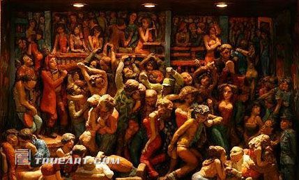 李占洋在1998年创作的场景雕塑《丽都》中,描绘了一个浮华、纵欲和狂欢的世界。拥挤着袒胸露乳的性工作者,酩酊大醉的商人政客,正在交欢的男男女女。而创作的灵感则直接来自艺术家对世俗生活的体验。1998年,29岁的李占洋去了位于北京丽都饭店附近的情色酒吧,那一次,艺术家第一次见识到了从蒙古来的性工作者们,“她们身穿裘皮大衣,高个儿,丰满,到了舞池就一阵乱舞,感觉很刺激。”李占洋这样描述。艺术家在酒吧里像个局外人,只在一旁观察人们的表情和行为。惊叹在光鲜外壳下,人们在白天和夜晚之间的转变,到处是肮脏、罪恶但又真实的社会缩影。看到了人们膨胀的性欲,看到了在烟雾弥漫下,人们对金钱的渴望。随后的一段时间里,李占洋经常去酒吧一带观察这些性工作者的生活。回来后,就创作了《丽都》。在这件作品里,艺术家用雕塑表达了人性的复杂本质和平民的社会性特质。