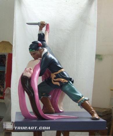在《大武松杀嫂》中,李占洋雕刻了英雄人物武松正要挥刀砍向半露酥胸的潘金莲的场景,可艺术家雕刻的武松是手持尖刀,面贴潘金莲半裸的身体,眼中充满复杂情欲地望着这个即将被自己杀死的妇人。在小说《水浒》中,武松的英雄形象深入人心,武松在杀淫妇时,书中描写他是“怒从心头起,恶向胆边生”,一刀捅了她。可是在李占洋的心中,武松应该是更加接近现实的人物。当他面对如此曼妙的胴体时,除了对于其通奸杀兄的仇恨以外,也应该夹杂着人性的本能欲望。李占洋的雕塑为“武松杀嫂”这一事件提供了另外一种可能性,一个考虑到人性现实的叙事方法。