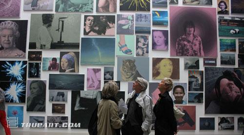 在遍走了本届卡塞尔几个主要的展场之后发现,挂满颜磊作品的场地是整个文献展上为数不多需要排队进入的展室,密集的图像轰炸让人猝不及防,在这间屋子里共有360幅画作分别悬挂在天花板、墙壁,以及可推拉的储藏绘画的装置里,可以说颜磊近些年所做的相当一部分绘画都被放置到了卡塞尔的这间展室里,在其中我们发现了波提切利笔下的维纳斯,英女王,故宫角楼,荷兰画家维米尔笔下戴珍珠耳环的少女,艺术家的自画像,不同国家不同时代的名人画像,各类日常生活图像,普通人的照片……颜磊的这个名为”有限艺术项目”的计划在文献展的100天里,将每天发生一点变化。颜磊及工作团队会陆续带一些作品到卡塞尔的大众汽车厂给画面喷漆,将原本的图像喷成单一色块后再带回展览现场,这些图像最后都将变成各种颜色的色块重新挂回原来的位置,只有背后的签名记录着画作被喷漆之前的名称。