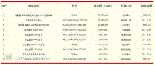 香港的钟表拍卖做的风生水起,中国国内的拍卖行肯定也不能只是隔岸张望。自2009年秋拍开始,中国嘉德、北京保利、北京歌德也纷纷开设名表专场。仅北京保利2009年第一场名表专场的成交额就达到了4000多万元。看准了中国人对古董钟,尤其是宫廷御制的古董钟的特别关注,一款品相优良的清乾隆年间的“铜鎏金转花转水法大吉葫芦钟”在2011年春拍的“乾隆巴洛克——清宫御制钟表与洋彩如意万代尊”专场上拍出了7,820万元,同样是乾隆年间的“铜鎏金转花西洋童子打乐钟”拍了1,840万元。在现代腕表方面,北京保利的一款百达翡丽全球唯一的型号为4908/1131全镶钻腕表以517.5万元成交,这款手表的表盘镶有39颗钻石,表壳42颗,表链484颗,表冠上1颗,共计536颗。所有钻石颜色均匀、净度相称、切功和镶嵌优良,这样的品质实属罕见。在2011年5月24日中国嘉德的春拍上,213件名表获得了3,149.94万元,比2010年秋拍的1,871万上涨68%。摘得该场头冠的是一枚2007年制的百达翡丽型号5002P的星月陀飞轮天文腕表,以828万成交。这枚及其罕见的双面铂金腕表是该品牌生产的功能最为复杂一款,具有三问、陀飞轮、万年历、逆跳飞返日期、日、月及闰年显示和星体移动的夜空图等12项复杂功能。一枚同型号的腕表曾经在香港苏富比2008年春季拍卖会上创下了1,057万元人民币的记录,这也是百达翡丽的最高拍卖记录。具香港苏富比钟表部资深专家陈凯嘉介绍:“内地买家现在占香港苏富比的40%,他们喜欢的东西跟市场的趋势差不多,由于现在越来越多的品牌选择在内地开店,内地买家对独立制表师的了解也不比香港或者国外藏家少。大部分人买来手表也是用于自我佩戴和收藏,这与国际上的情况也是差不多的。”
