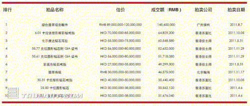 珠宝翡翠的专场拍卖在全世界都有着悠久的历史和火爆的人气。香港苏富比的珠宝拍卖已经有了20年的历史。在2011年4月6日的香港苏富比春季拍卖中,“瑰丽珠宝翡翠首饰专场”的成交额达到了4.174亿元,成交率78.12%。在秋拍“瑰丽珠宝”的专场中,359件精美首饰以5.1亿元成交,成交率78.27%, 比2010年秋拍同名专场的4.23亿元有了22.2%的增长。前三名的拍品均为钻石。佳士得在珠宝翡翠拍卖方面也已有专业的水准和稳定的市场额。在2011年的春拍中,“瑰丽珠宝及翡翠首饰”专场以6.96亿元,80%的成交率完美落槌,比上年春拍4.7亿元的成交率上升了48.1%。秋季拍卖中首饰专场的238件拍品也拍出了6.45亿元的成绩,比2010年秋季拍卖中303件拍品的6.12亿元上涨了5%,可见2011年强劲的势头。前三名的拍品同样为钻石。在中国国内,虽然这类奢侈品拍卖与传统拍卖项目在价格上还有着较大的差距,但已明显看出人们追求新型拍卖种类的需求。北京保利、中国嘉德、北京翰海等国内拍卖行都自2011年起推出了珠宝翡翠拍卖的专场以满足客户的需求。2011年6月6日,北京保利举办了“春华熠彩——首届名贵珠宝专场”,147件珍品获得了1.4亿元的成绩,其中92件拍品易主,成交率达到62.59%。18件拍品过百万元,4件突破千万元。秋拍中的“金云盈枝”专场的成交额达到1.57亿,322件珍品以48.45%的成交率落槌。单品成交价的前三名均为翡翠。北京翰海的“翡翠珍品”的上拍量为95件,成交率为50.55%,成交额为1.034亿元。