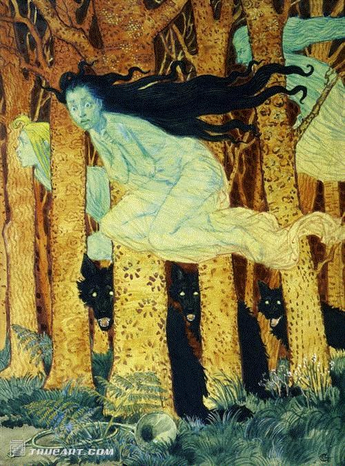 女巫是黑色浪漫主义绘画经常出现的主题。图为法国新艺术时期瑞士裔画家欧仁·萨缪尔-格拉塞的《三个女人和三匹狼》