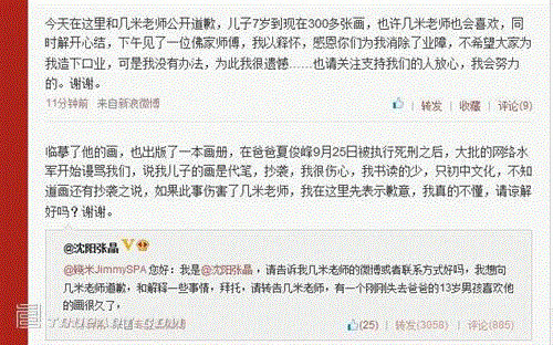 该微博发出后,张晶在其实名微博中连续发出3条微博,向几米公开道歉,引发更多网友的指责。昨天晚上,不堪其扰的张晶解释,强强确实临摹了几米的画作,但并非抄袭,自己道歉是不愿意伤害他人。“我只有初中文化,不知道画还有抄袭之说,又没能联系上几米老师,所以先把这个责任揽下来”。