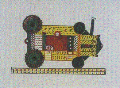 拿到画笔后,王军的精神变得充实而安静。他画山、画拖拉机、画收割机、画火车,圈圈点点,不假思索随手拈来,视角自由而又神秘,图形奇形怪状,郭海平刚开始也懵了:山是从上面俯视的螺旋形,拖拉机是将各个视角结合在一起,他的视线甚至可以在拖拉机内部游走。