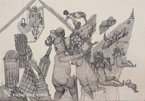 南京原形艺术中心负责人郭海平策划的“非理性之美——原生艺术十人展”上月在朝天宫南京博物馆展出。署名“巴子”的钢笔画,在一片色彩斑斓的画作中尤显独特。密密麻麻的黑白线条缠绕出奇怪的人形,密不透风的画面,大量使用夸张、怪异、变形手法,给人惊悚的美学体验。