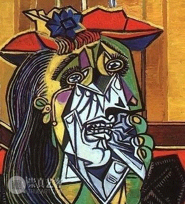 《哭泣的女人》创作于1937年,正值弗朗哥勾结法西斯势力在西班牙发起内战,而毕加索的两位情人多拉·马尔和玛丽·泰莱斯也在他的画室发起了家庭内战,多拉·马尔经常不能自抑地大哭,这大概也是这幅肖像的起因。画面上是一张看上去杂乱无章的面孔,眼睛、鼻子、嘴唇完全错位摆放,面部轮廓结构也全被扭曲、切割得支离破碎。这是毕加索最具实验性的肖像作品之一,即便呈献给观众的是完全变形的面孔,还是能让人感受到画中人歇斯底里的悲恸,她仿佛是因为无法控制的情绪而面部痉挛,粗硬的黑色线条和令人焦躁的纯色加强了画面的张力,红、绿、紫、黄、黑、白,几种颜色以最不和谐的色调搭配在一起,让观者在这心碎的女人面前也手足无措起来。