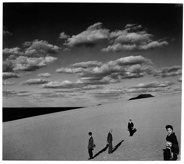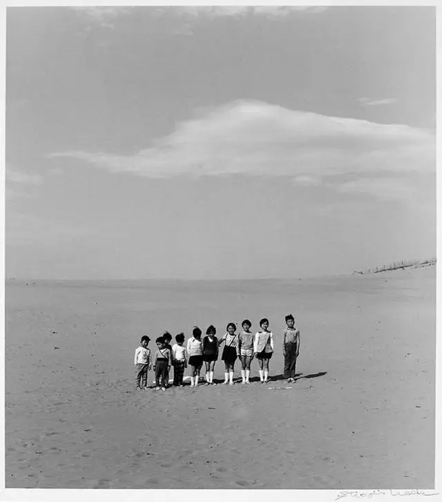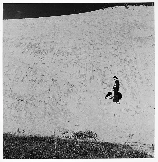 离植田正治家只有5分钟车程的鸟取沙丘是他大部分作品的舞台,也成为了他的“签名”。 植田正治镜头中的人物充满舞台感,多半拜这荒芜沙丘所赐。他著名的“小狐登场”犹如作者本人的亮相,这是他直接“威胁”观者的;在另一些照片里,那些人物却仿佛始终处于他们自己的自顾自的一个世界中,而摄影师截取了他们的一个截面给“观众”看)。植田正治以舞台形式召唤旧日时光,或者压根是生活深处的又一重生活——一种未必存在于生活表面,但始终存在于生活深处并且持续上演永不终结的一个内在世界。