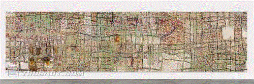 艺术家马克·布拉德福德先生介绍,自己初到上海便为外滩美术馆的建筑所着迷。而在沪期间他又从上海意识形态交汇的影响和感染力中,第一时间发现了一个熟悉并值得关注的点,继而在本地市场上找到租界时代的老地图,引发出自己对上海租界时期的分割状态、城市布局变迁的研究兴趣,包括中国多数居民所在的老城厢,外来的日本地址系统对中国地址系统的改变,以及这座城市在前工业时代的面貌——即上海城市实体百余年来的布局和变迁,成型与再造。正是以这种丰富的语境为灵感和出发点,马克·布拉德福德创作出了3幅壁画般的炫目作品,每幅长逾40英尺(12米),另有一组包含8件雕塑的组合作品。