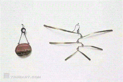 佩姬·古根海姆的耳环,左边一只根据唐吉超现实主义画作设计,右边根据考尔德的雕塑设计