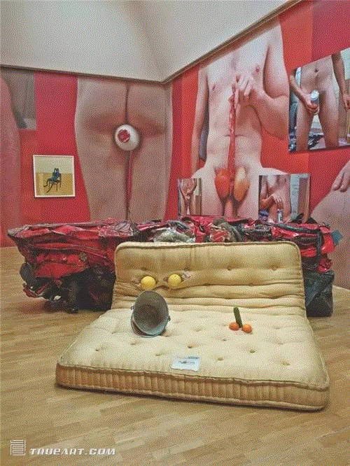 在“太空乳房”(Tits in Space, 2000)里,卢卡斯运用这种特别的幽默批判享乐的消费主义文化。作品里,板面上的照片墙纸展现的是,由一簇簇的香烟集成的女人乳房形状,看起来似乎在黑色的背景下飘浮着。
