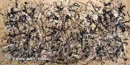克拉克确信,波洛克的“抵抗”形式大体上伴随着特殊的“表现性”(expressiveness)效果的再现,如画面密集性和夸张的姿势,这些都是“粗野”的表现。抽象表现主义画家除了投身于“整体性”抽象的膨胀空虚之外,无所可去,“他们真正消耗了自己的空虚的强度,他们摆弄着绘画的姿势,呈现着荒谬的巨大和夸张”(Harris “Stuck” 26)。克拉克认为,现代主义将媒介当作对于资本主义总体性的“最典型的否定和疏离的场所”,极端的媒介实验本身便是否定的实践(Greenberg 152)。抽象表现主义绘画正是以这种粗野而密集的绘画行为和媒介实验,向美国的消费者资本主义和冷战社会表达了一种抵抗。但是,到了1950年,波洛克就“不再那么投入地进行自我消耗了,差不多达到一种和谐状态。” (“In Defence” 30)。